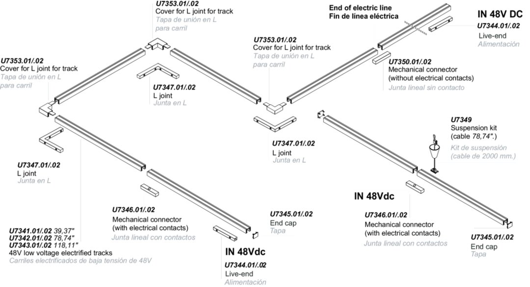 Proiettore su asta orientabile per binario 48V con corpo in alluminio e sorgente COB LED, riflettore con diverse aperture: 24°, 38° e 58°
