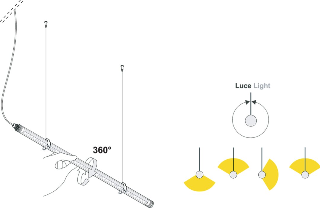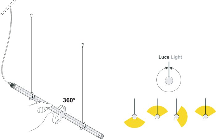 Lampada a sospensione realizzata con una barra luminosa orientabile a LED IP54 in metacrilato trasparente coestruso anti-UV, terminali in acciaio inox AISI 316L