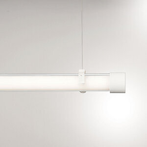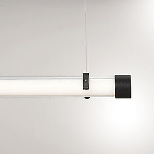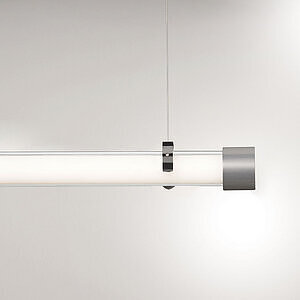 Schiebelampe am Stahlseil mit diffusem Licht, das sich durch einen Lichtaustritt von 360° auszeichnet, mit einem transparenten Methacrylatkörper und Endkappen aus Aluminium. Die Stahlseilspanner sowie die Rosetten mit integriertem Driver sind je nach gewählter Zusammensetzung separat zu bestellen. Rosetten mit dimmbaren Treibern für PUSH, 1...10V, TRIAC oder DALI-Steuerung sind ebenfalls erhältlich.