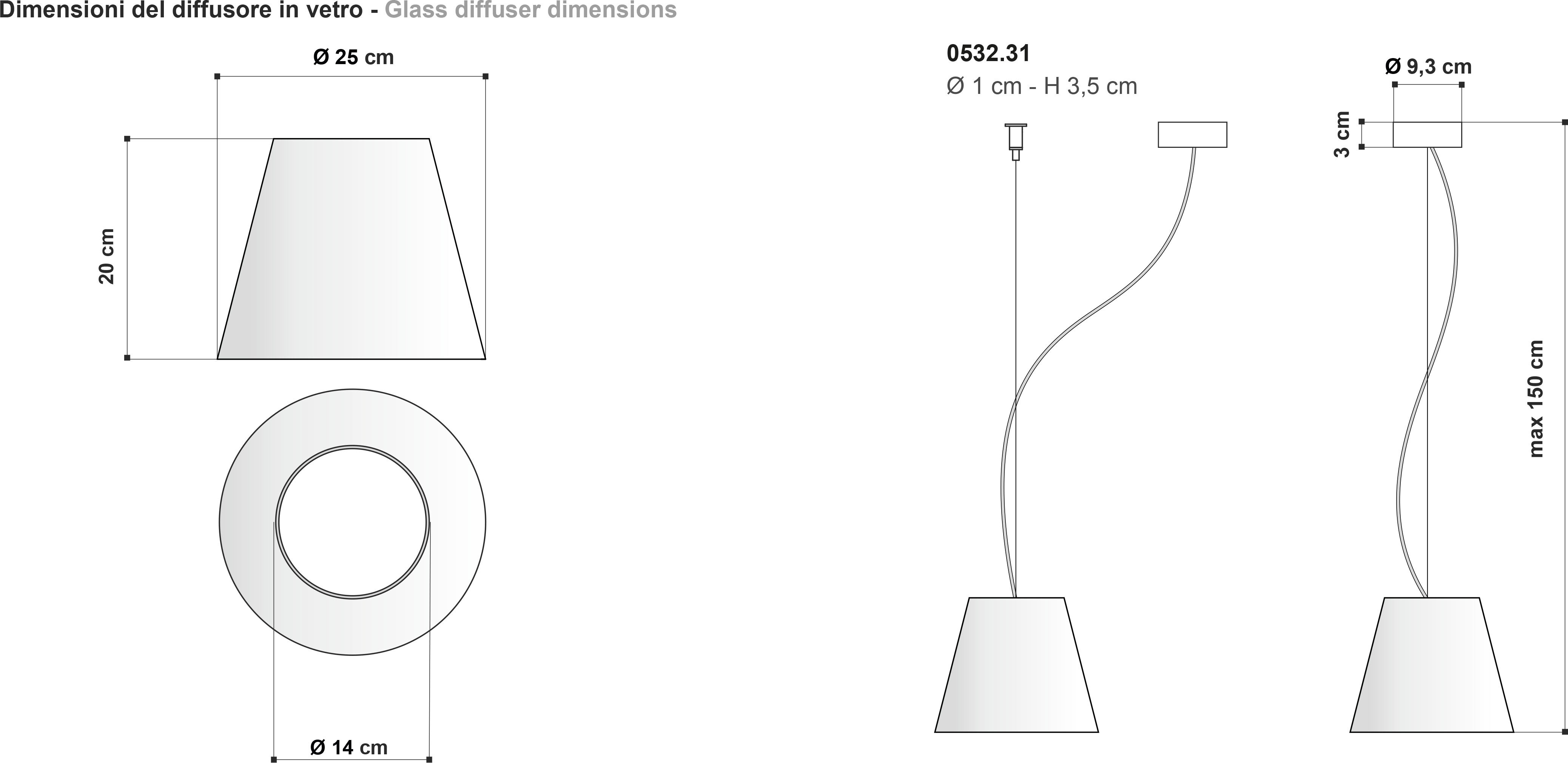 The design of the lamp is all about the volume of the diffuser, a cone that when the lamp is turned on enhances the beauty of blown glass and its ability to diffuse light in the room.