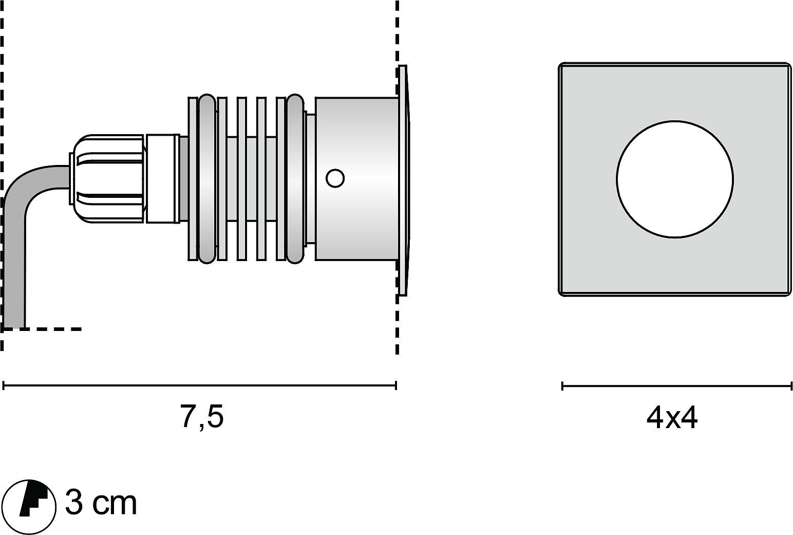 IP67 walkable downlight with diffused light with square flange made of AISI 316L stainless steel, aluminum heat sink, frosted glass screen and 30-centimeter neoprene cable.