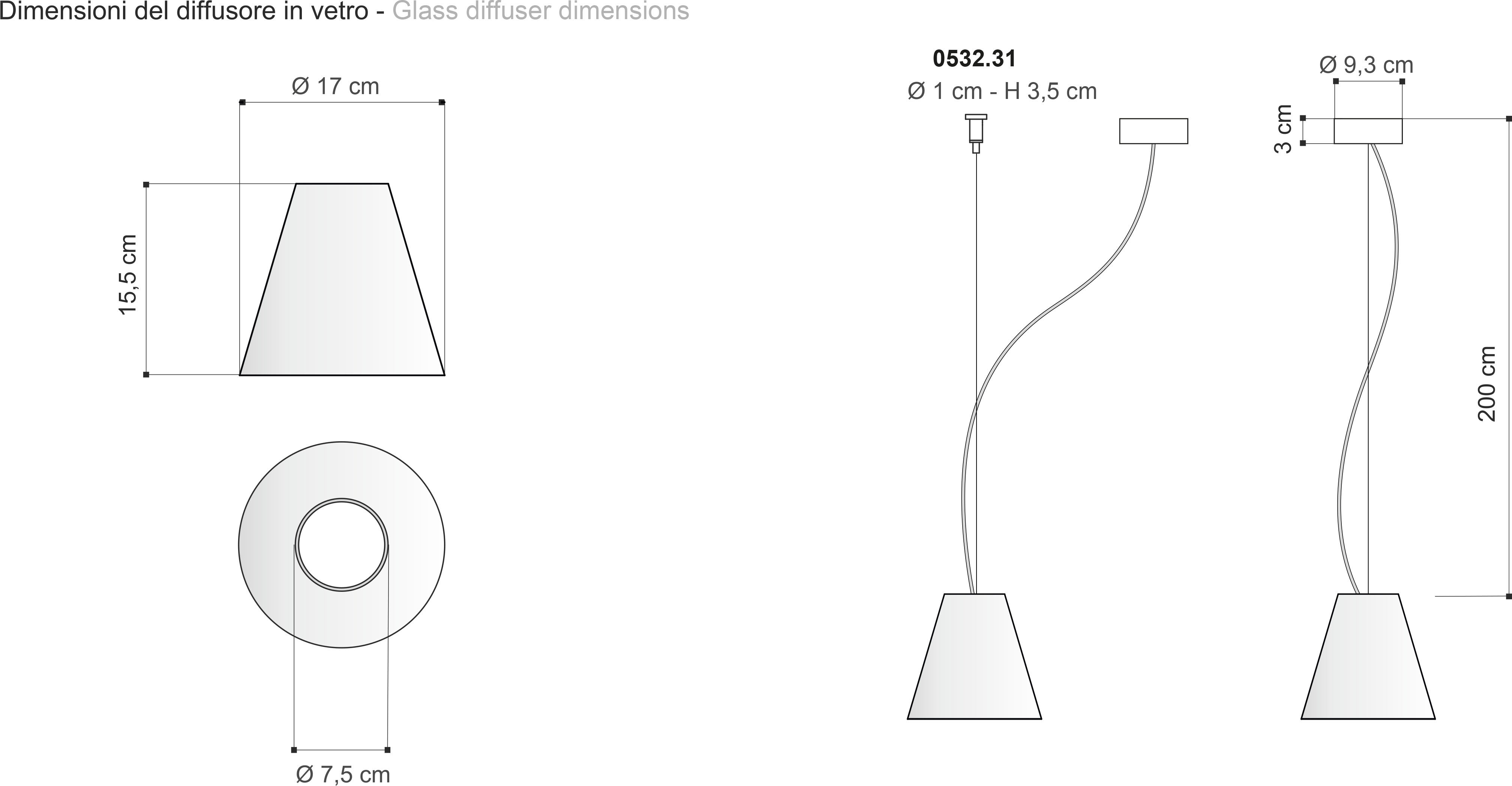 El diseño de la lámpara se caracteriza por el volumen del difusor, un pequeño cono que al encender la lámpara realza la belleza del vidrio soplado y su capacidad para difundir la luz en la habitación.