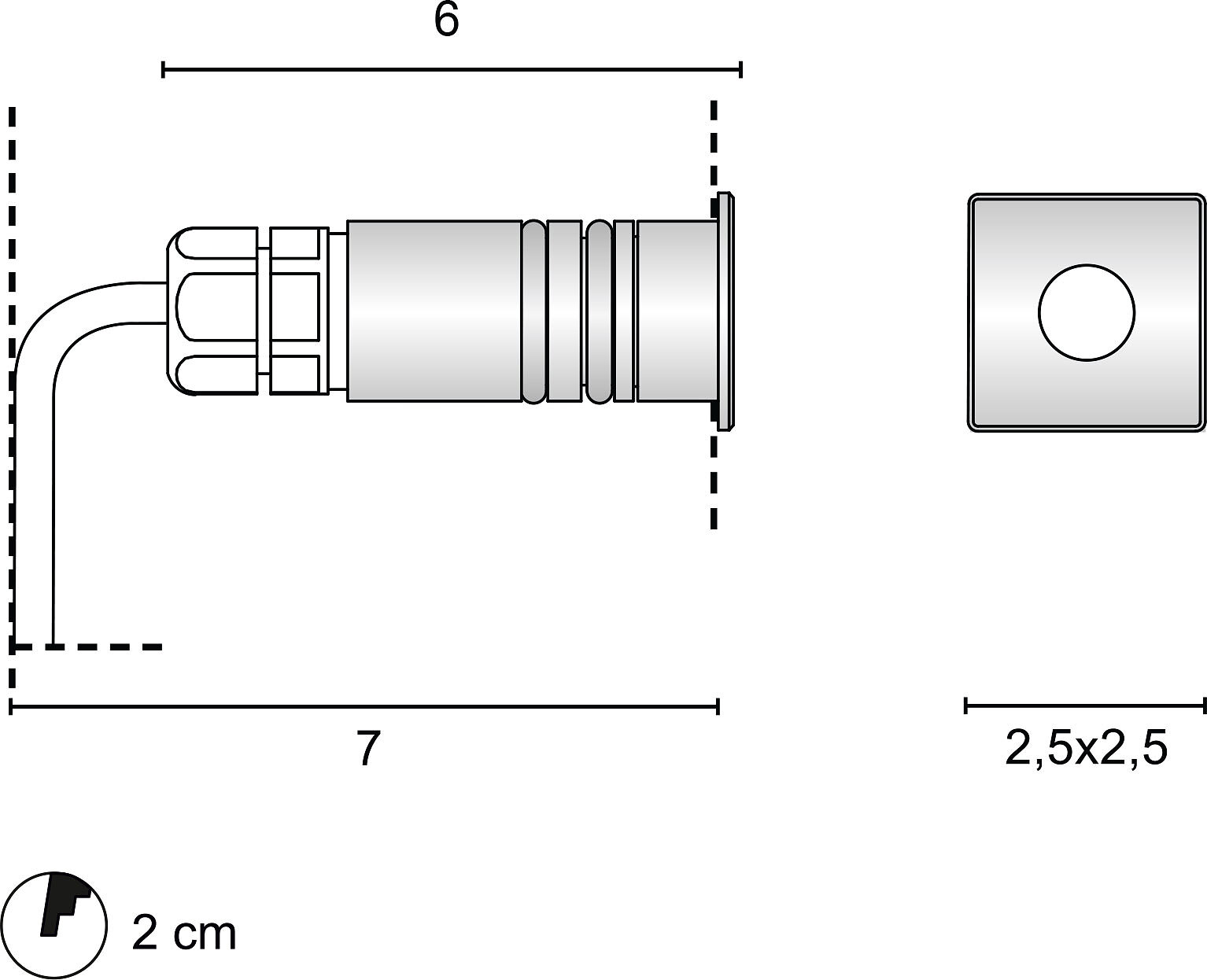 Mini downlight orientable IP67 con brida cuadrada de acero inoxidable AISI 316L, pantalla de cristal, aperturas ópticas de 11°, 25° o 45°, disipador de calor de aluminio y cable de neopreno de 30 cm.