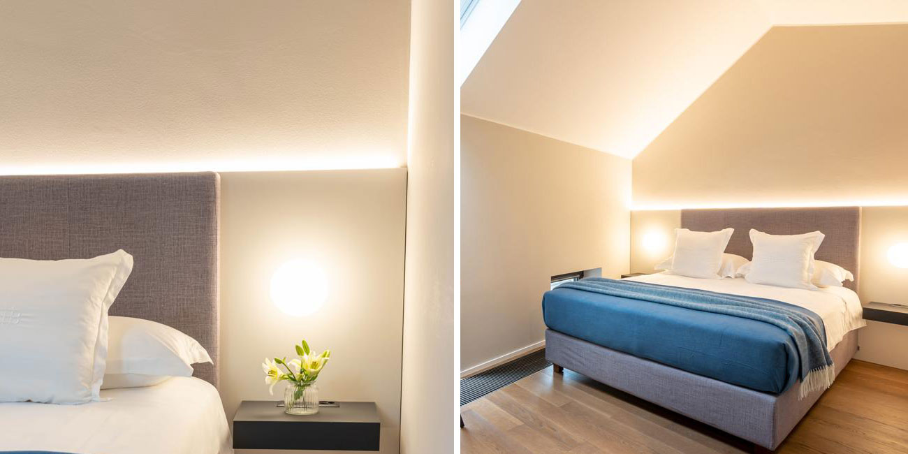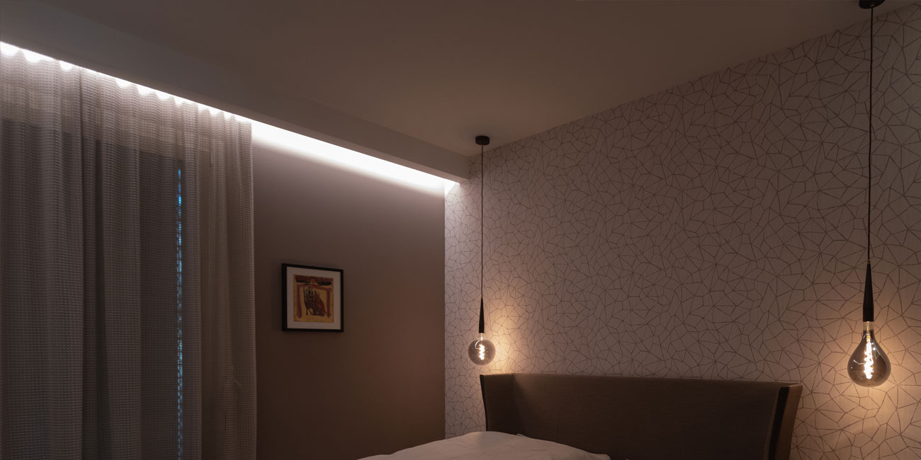 Il nostro ultimo consiglio per la vostra camera da letto ideale comprende l’illuminazione dell’armadio. Illuminatelo dall’interno con incassi integrati nella struttura CRI90 o utilizzate strisce luminose da incasso.