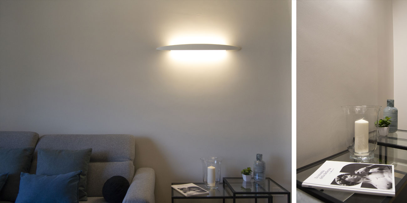 Le applique a parete rappresentano una soluzione versatile fornendo una valida alternativa alle luci a sospensione per non ridurre ulteriormente la percezione dello spazio quando il soffitto del living non è molto alto.