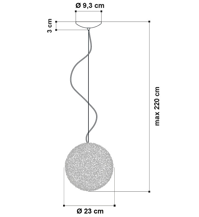 Lampada a sospensione realizzata in filo di metacrilato intrecciato e sovrapposto, con struttura in metallo verniciata in bianco opaco, portalampada con attacco G9, rosone in policarbonato e cavo di alimentazione trasparente.
