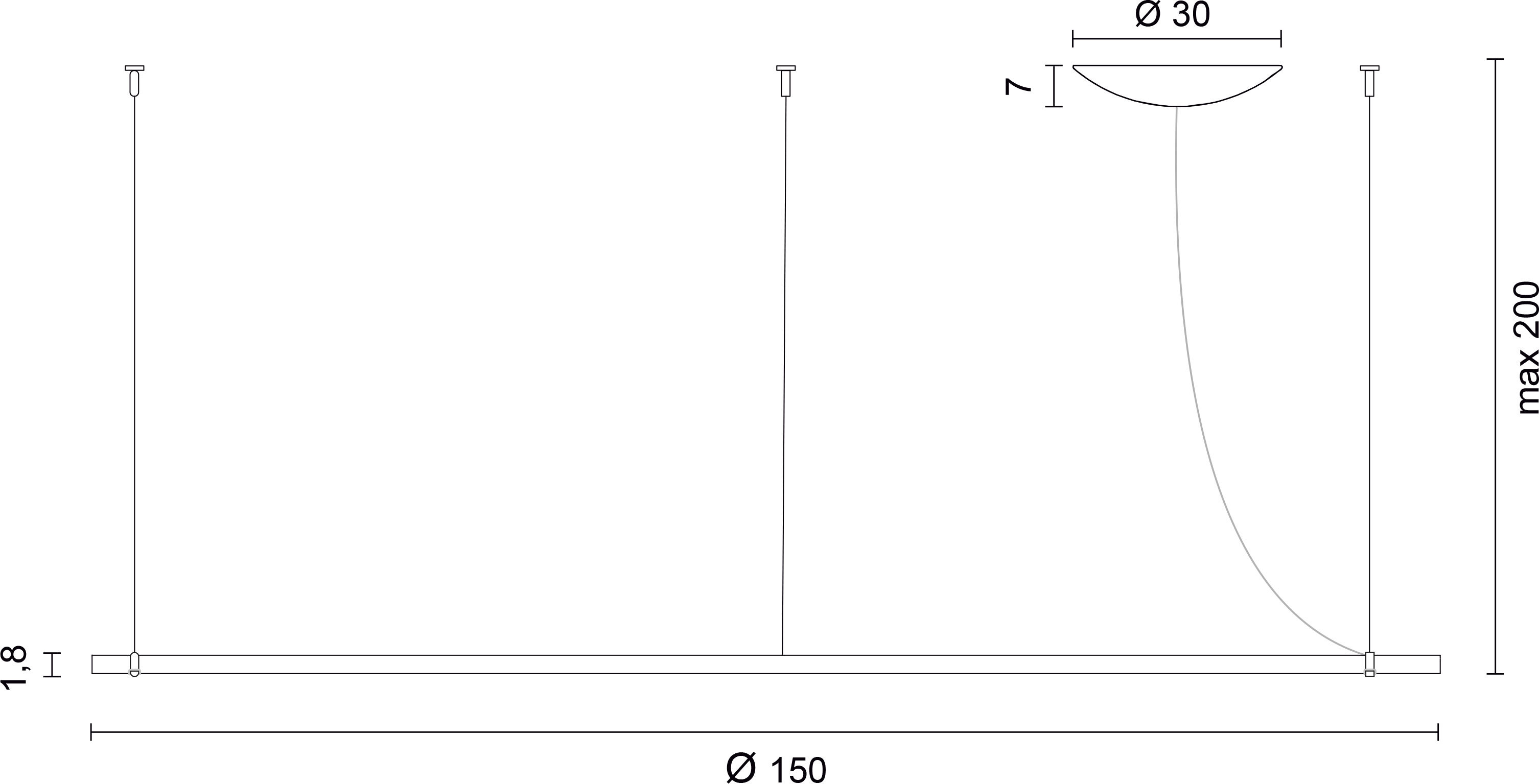 Lampada a sospensione a luce diffusa con corpo in trafila di alluminio calandrata, diffusore in policarbonato opale, circuito da 18W/mt e 180 LED/mt con CRI>90, cavo di alimentazione coassiale di 250 centimetri, completa di kit di fissaggio e rosone con driver integrato.