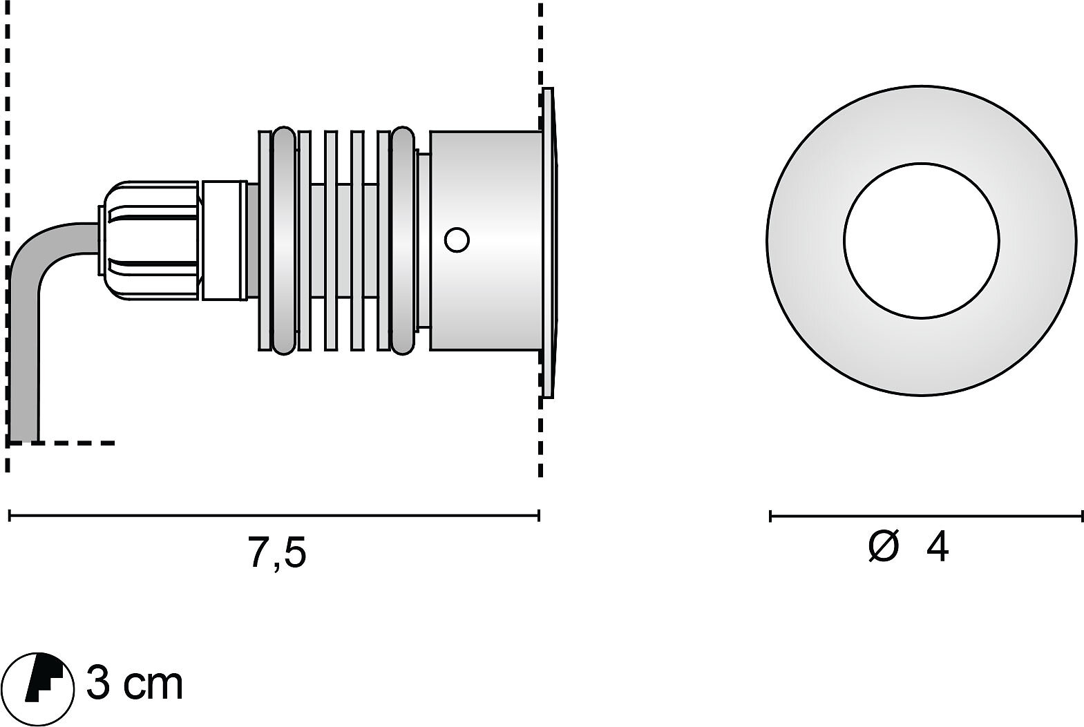 Faretto da incasso calpestabile IP67 a luce diffusa con flangia tonda in acciaio INOX AISI 316L, dissipatore in alluminio, schermo in vetro satinato e cavo in neoprene da 30 centimetri.