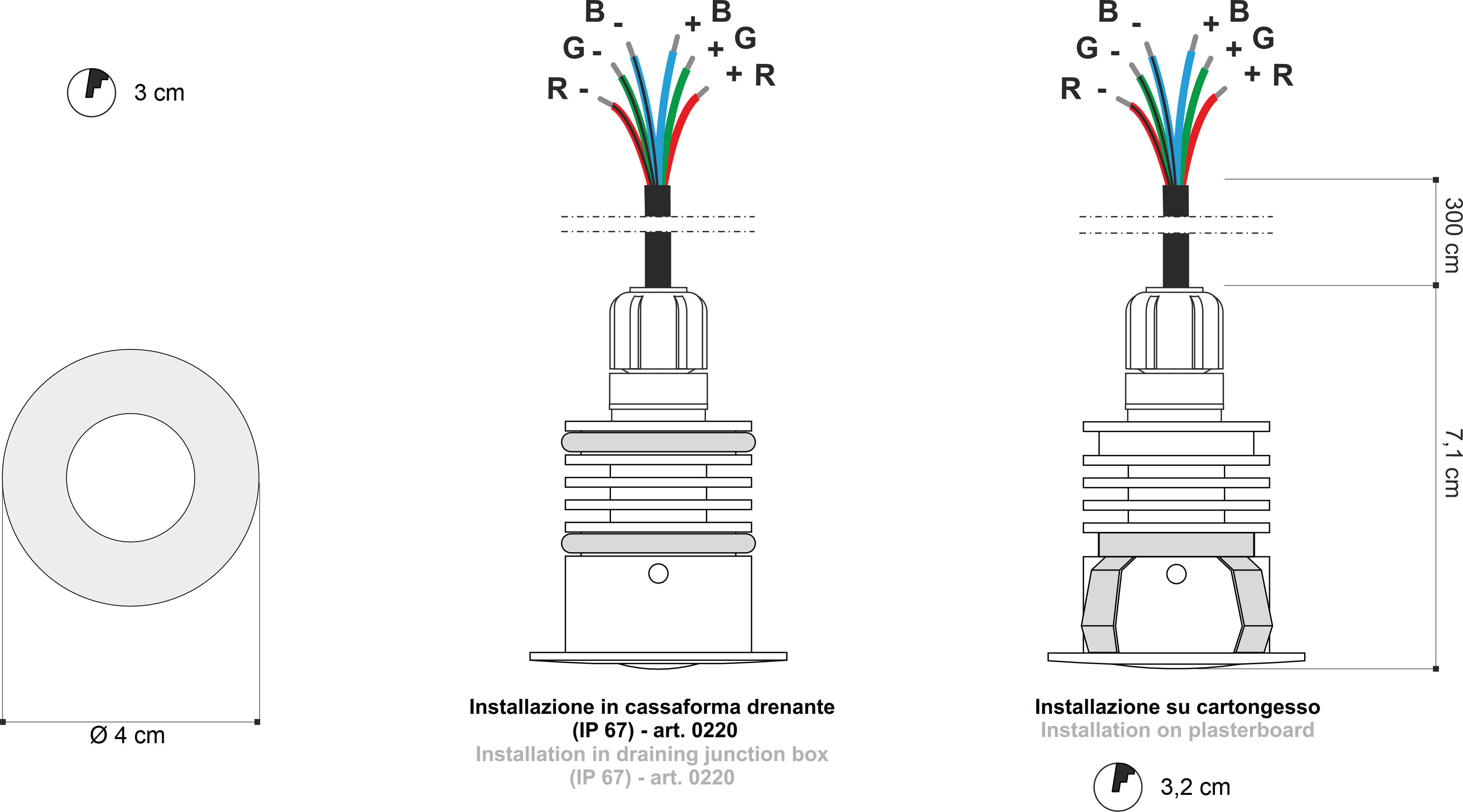 Прожектор может быть установлен на гипсокартон с помощью специального аксессуара, входящего в комплект поставки, или в каменную кладку с помощью специальной опалубки, которая заказывается отдельно.